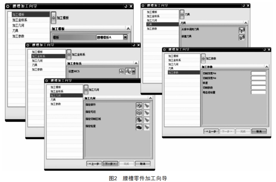 以腰槽類零件為例,通用加工工藝路線配置加工模板,再結(jié)合向?qū)郊庸みM(jìn)行腰槽零件的數(shù)控編程,實現(xiàn)刀具路徑的快速生成。主要操作步驟如表1所示,相關(guān)界面如圖2所示。