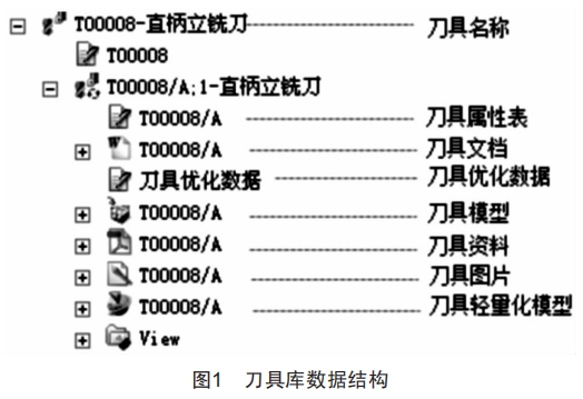 根據(jù)目前航空機電零件使用刀具的類型、型號、品牌、裝夾方式等進(jìn)行分類統(tǒng)計,刀具數(shù)據(jù)包括刀具名稱、刀具屬性、優(yōu)化數(shù)據(jù)、刀具模型、刀具相關(guān)文檔和資料等,如圖1所示。