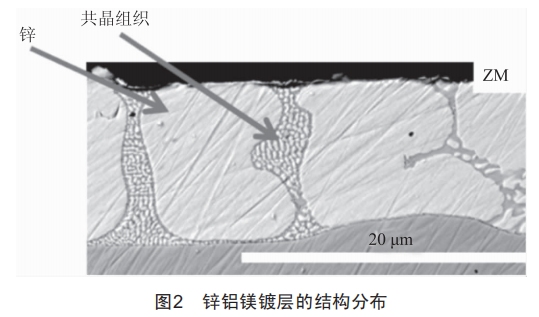 在傳統(tǒng)純鋅鍍層(GI)中添加一定量的鋁和鎂,形成如圖2所示的鋅鋁鎂鍍層(ZM)。