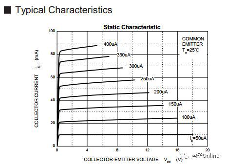 從特性曲線中可以看到,我們給8050設(shè)置靜態(tài)工作點(diǎn)時(shí),將Ib設(shè)置在200uA-250uA間較合適,為便于計(jì)算,將Ib設(shè)為200uA。