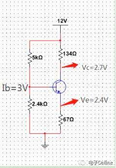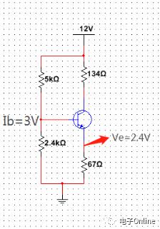 視頻中講到過,“三極管工作在放大狀態(tài),就是不能夠讓它工作在飽和區(qū)和截止區(qū)”。那根據(jù)這一個結(jié)論,我們知道,當(dāng)三極管工作在截止?fàn)顟B(tài)時,Vce=0.3V;同時在“有偏置放大電路”的設(shè)計視頻中有講解到,有偏置電路中的E極是受B極的電壓影響的,同時根據(jù)實際需求,我們通常將設(shè)置在2~3V間。視頻中我們將Vb設(shè)置在3V,則Ve就為2.4V。