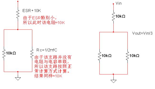 根據(jù)上圖可以知道,在等效圖中,電容的ESR與10K電阻其實(shí)是一個(gè)串聯(lián)狀態(tài),意思是指此時(shí)電容的ESR可以等效為10K+ESR,而同時(shí),其諧振頻率可等效為:f=1/2π(10K+ESR)c;這也就意味著,當(dāng)信號(hào)頻率等于諧振頻率時(shí),整個(gè)RC電路可等效為下圖所示: