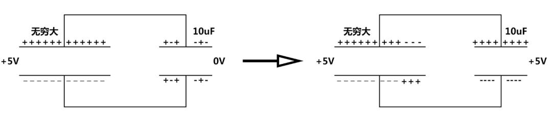 現(xiàn)在假設(shè)有一個(gè)容量無(wú)窮大的電容,其上面存在著+5V的電壓,當(dāng)將其與一個(gè)10uF的電容并聯(lián)時(shí),10uF的電容上也會(huì)儲(chǔ)存有+5V的電壓。如圖3所示: