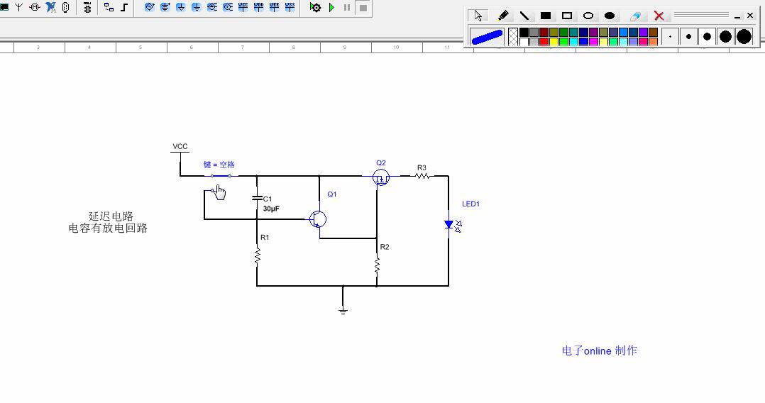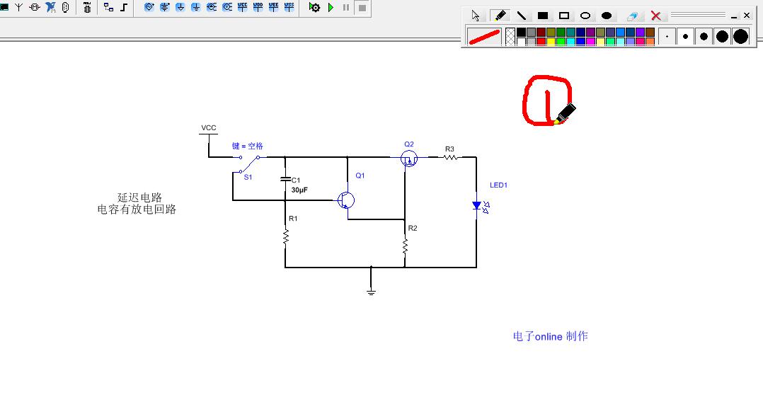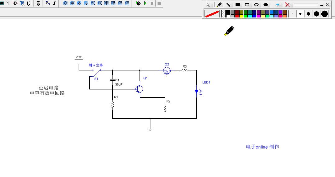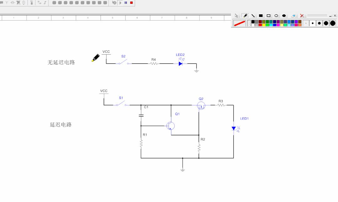 二、為了保證延時時間穩(wěn)定,必須要給電容C1加上放電回路,否則延時電路在第二次上電時會失去延時效果。仿真如下所示: