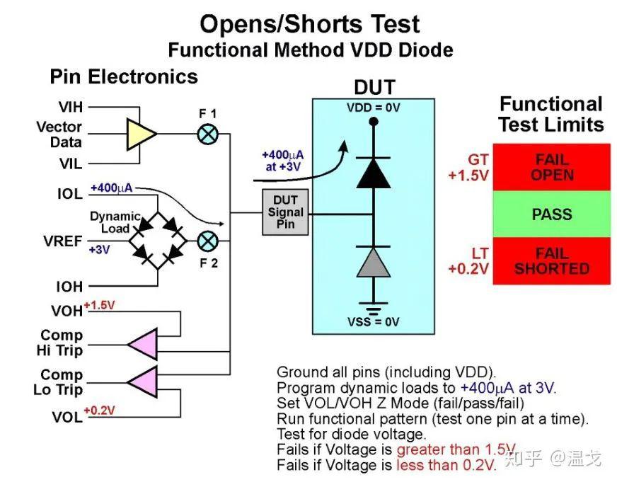 以下這張圖就是open/short test原理示意圖,DUT(Device Under Test)的引腳都掛有上下兩個保護(hù)二極管,根據(jù)二極管單向?qū)ㄒ约敖刂岭妷旱奶匦?,對其?灌電流,然后測試電壓,看起是否在設(shè)定的limit范圍內(nèi)。