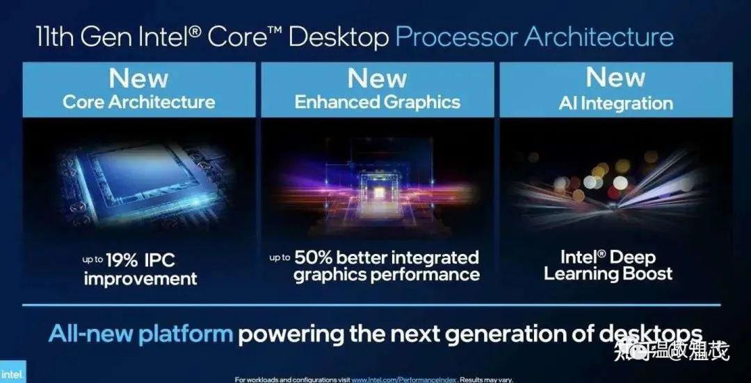 架構(gòu)對(duì)一個(gè)芯片的性能來(lái)說(shuō)也是至關(guān)重要的--以Intel最新發(fā)布的第11代酷睿處理器Rocket Lake-S為例,新的架構(gòu)為其帶來(lái)了約 19% 的 IPC (每時(shí)鐘指令數(shù))提升,以及更好的 AI 性能。