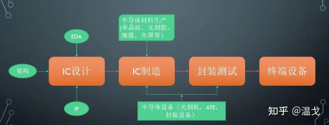 芯片的整個產(chǎn)業(yè)鏈?zhǔn)呛荦嫶蟮模毼灰策_幾十個。從EDA到設(shè)計,從材料到制造,再到封裝測試及應(yīng)用,其中也需要設(shè)備的支持,比如光刻機,刻蝕機,ATE等。
