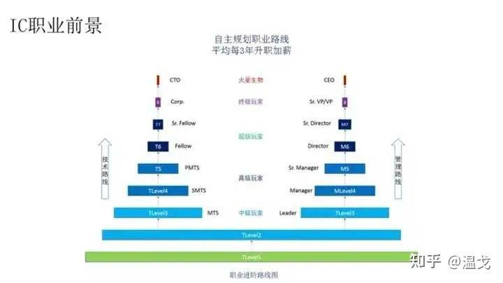 對于IC設(shè)計職位的晉升,無論是走技術(shù)路線還是管理路線,在工作的前六年主要精力都放在技術(shù)提升上,并無太大差別。職級提升大概如下:碩士畢業(yè)0~3年(對應(yīng)本科0~5年):level 1碩士畢業(yè)3~6年(對應(yīng)本科5~8年):level 2碩士畢業(yè)6+年(對應(yīng)本科8+年):level 3
