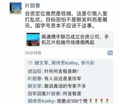 葉甜春在其微信上做出評(píng)論:“合資定位竟然是低端,這是引狼入室打亂仗。目標(biāo)恐怕不是聯(lián)發(fā)科而是展訊。國(guó)字號(hào)資本不應(yīng)該干這事?!?/span>