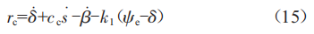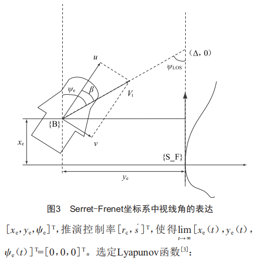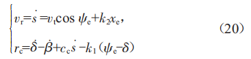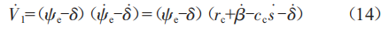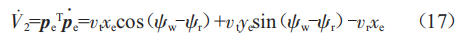 根據(jù)圖像關系有曲率cc與參考舶向角及參考角速度之間的關系:sr=o·r=cc(S)S·,ow=oB+8,o·w=sw=rc+8·。對Lyapunov函數(shù)進行微分則有:
