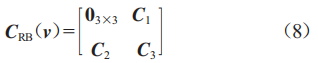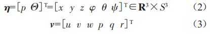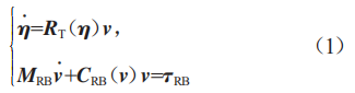 式中:,為UUV所有狀態(tài)量型值所組成型向量:RT(,)為動系到定系型轉(zhuǎn)換矩陣:v為狀態(tài)量型變化速度:MRB(v)∈R6×6為慣性矩陣:CRB(v)∈R6×6為船體科里奧利向心力矩陣:TRB為UUV所受外力及外力矩所組成型向量。