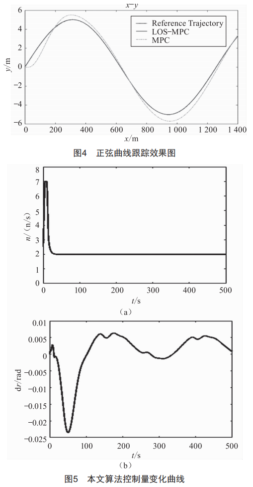 圖4、圖5為具體的正弦路徑跟蹤仿真圖,由圖可知,本文所設計的算法與MPC全控算法都能跟上參考軌跡,但可以觀察到,MPC全控算法的誤差較大,特別是在路徑轉(zhuǎn)彎處偏離最大,而本文所設計算法誤差更小,且相對于MPC全控算法能較快收斂至參考軌跡:所設計控制器的兩個控制量的變化基本也同狀態(tài)量趨勢一致,艦方向舵穩(wěn)定后呈周期變化,轉(zhuǎn)速穩(wěn)定后為定值,而舶向角也能迅速反應并呈周期變化。