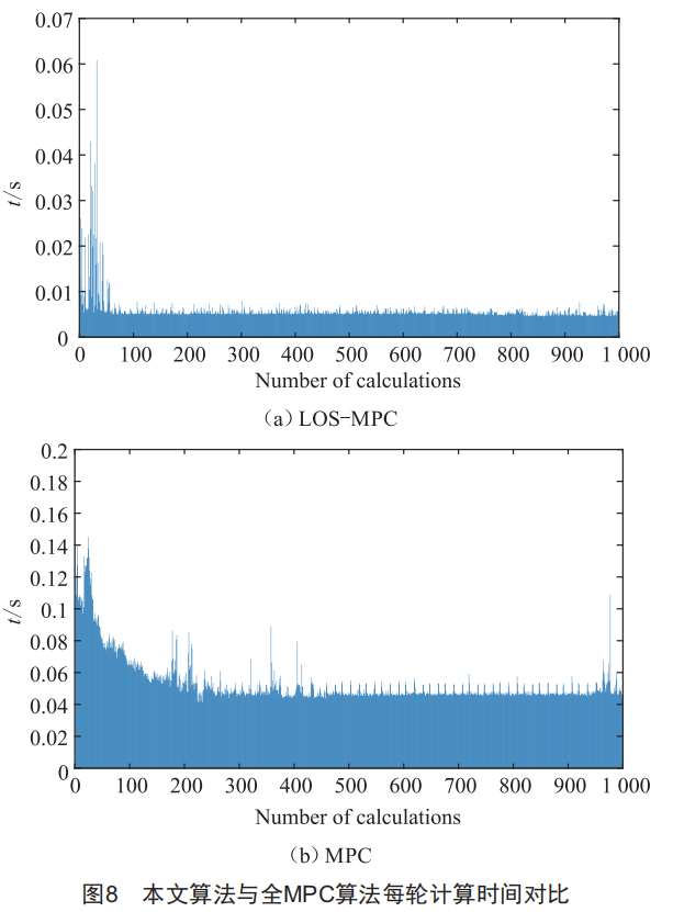 由圖8可以發(fā)現(xiàn),本文所設計的算法每輪計算時間平均在0.005s左右,而MPC每輪計算時間平均在0.015s左右,由此驗證本文算法在節(jié)省計算時間上的確有較明顯的優(yōu)勢。