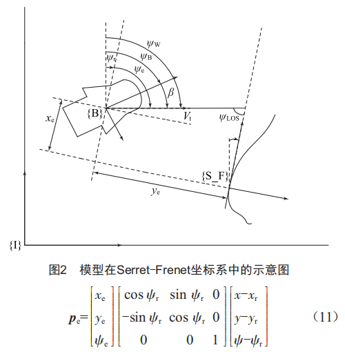 serret-Frenet坐標系是以參考軌跡上的點為原點,以該點引出軌跡的切向方向為x軸的坐標系,該坐標系的應用可簡化側(cè)漂角以及視線角的表達。該坐標系中運動學方程的建立,需要將慣性坐標系中的運動學方程進行轉(zhuǎn)換,即左乘旋轉(zhuǎn)矩陣,該旋轉(zhuǎn)矩陣為慣性坐標系到serret-Frenet坐標系的矩陣,圖2為模型在serret-Frenet坐標系中的示意圖。