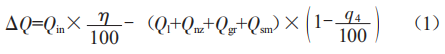 式中:Qin為鍋爐輸入熱量(kJ/kg):7為鍋爐效率(%):Q1、Qnz、Qgr、Qsm分別表示爐膛、凝渣管束、過熱器、省煤器的吸熱量(kJ/kg),它們是通過熱平衡方程式得到的:g4為機械不完全燃燒熱損失(%)。