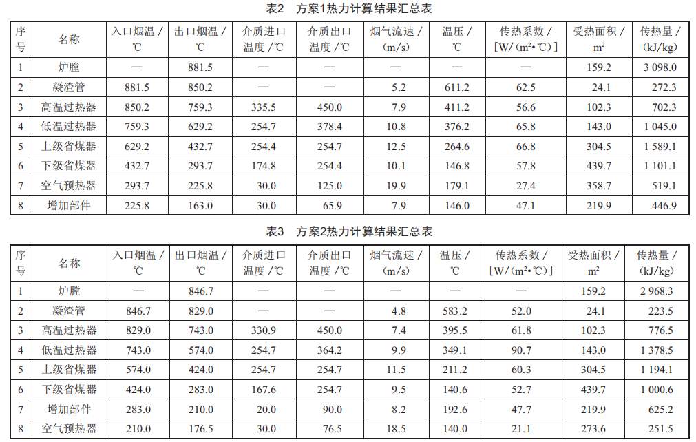 方案3:移除下級空預器,換熱器受熱管束采用順列布置,熱力計算結(jié)果匯總于表4。