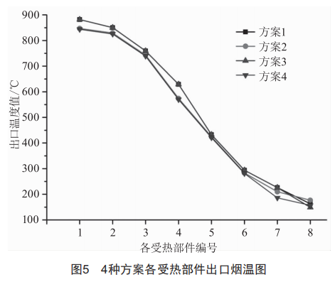 圖5為4種方案中各受熱部件出口處的煙溫值,各受熱部件編號為1~8,分別代表爐膛、凝渣管、高溫過熱器、低溫過熱器、上級省煤器、下級省煤器、空氣預熱器以及增加的換熱器。
