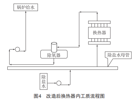 加裝的煙氣一水換熱器與省煤器結(jié)構(gòu)一樣,不同之處在于換熱介質(zhì)水沒有進行除氧,溫度接近普通水溫,壓力也處于常壓狀態(tài)。改造后的流程為普通水除鹽后進入換熱器參與換熱,溫度升高后進入除氧器進行除氧處理,然后作為鍋爐給水送入鍋爐中。具體流程如圖4所示。