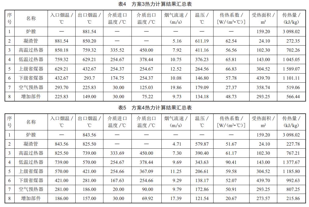 方案4:移除上級空預器,換熱器受熱管束采用順列布置,熱力計算結(jié)果匯總于表5。