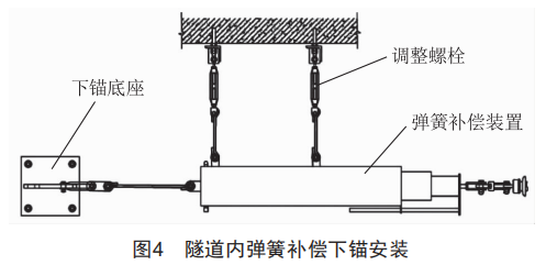地鐵接觸網(wǎng)一般在隧道內(nèi)采用剛性懸掛,在隧道外采用柔性懸掛。但也經(jīng)常有兩段高架橋之間夾著一段小隧道,為減少剛?cè)徇^渡的次數(shù),通常會選擇在該段隧道內(nèi)設(shè)置柔性接觸網(wǎng),并在隧道內(nèi)設(shè)接觸網(wǎng)下錨。隧道內(nèi)彈簧補償裝置下錨的安裝方式如圖4所示,彈簧的中部和尾部均需通過隧道頂部進行懸掛,并通過調(diào)整螺栓保持彈簧與下錨支線索的共線,彈簧尾部可根據(jù)需要固定在隧道側(cè)壁或通過下錨吊柱固定。