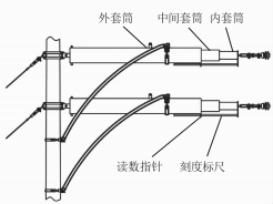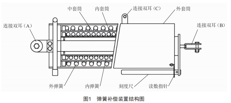 如圖1所示,彈簧補償裝置由內(nèi)部、外部彈簧通過套筒組裝而成,彈簧的材料采用高強度的彈簧鋼。裝置的頭、尾分別設(shè)連接雙耳,用于與線索下錨零件、錨固點之間的連接。外套筒的中部預(yù)留彈簧補償裝置的固定安裝雙耳,內(nèi)套筒的頭部安裝讀數(shù)標(biāo)尺。當(dāng)安裝完畢并按安裝曲線對接觸網(wǎng)線材施加張力后,內(nèi)部套筒被拉出,通過內(nèi)、外套筒與彈簧之間的傳導(dǎo),為接觸網(wǎng)提供恒定的張力輸出。