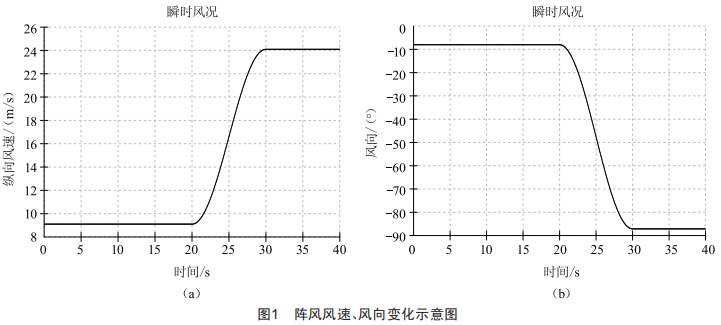 圖1為陣風(fēng)的風(fēng)速、風(fēng)向變化示意圖,可以看出在短時(shí)間內(nèi)風(fēng)速與風(fēng)向都發(fā)生了驟變,這對(duì)風(fēng)機(jī)的載荷和凈空都會(huì)產(chǎn)生很大的影響。