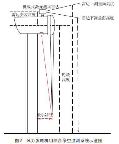 本文提出了一種激光凈空監(jiān)測系統(tǒng)和機(jī)載式激光測風(fēng)雷達(dá)相結(jié)合的綜合凈空監(jiān)測系統(tǒng)及配套的主動(dòng)凈空控制策略,圖2為系統(tǒng)結(jié)構(gòu)示意圖,激光凈空監(jiān)測系統(tǒng)可以部署于合適的位置,以實(shí)現(xiàn)對(duì)塔架一葉片凈空的實(shí)時(shí)監(jiān)測。當(dāng)葉片旋轉(zhuǎn)至可探測位置,凈空監(jiān)測系統(tǒng)的激光束可以迅速采集到葉尖測點(diǎn)到凈空監(jiān)測系統(tǒng)的距離,經(jīng)過坐標(biāo)變換,換算出塔架凈空值:機(jī)載式激光測風(fēng)雷達(dá)安裝于機(jī)艙上方,可以實(shí)時(shí)測量來流方向的風(fēng)剪切和風(fēng)速變化率。上述兩個(gè)設(shè)備的信號(hào)實(shí)時(shí)輸入風(fēng)力發(fā)電機(jī)組控制系統(tǒng)。