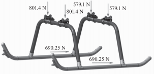 前重心起落架前后弓形梁承受的載荷如圖2所示。后重心起落架前后弓形梁承受的載荷如圖3所示。起落架各工況下載荷計算值如表1所示。