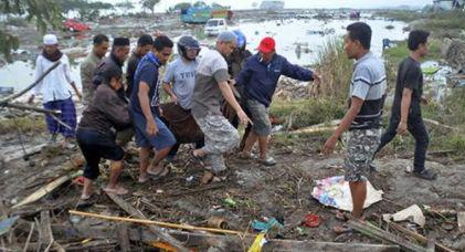 蘇拉威西省帕盧市當?shù)鼐用袂謇碛鲭y者遺體。