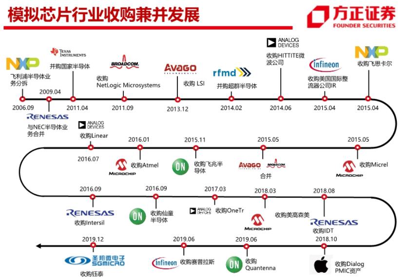 再加上模擬IC市場由于其產(chǎn)品線固有的分散多樣化特點,使得市場份額難以獲得大的提升,模擬芯片公司除了內(nèi)生增長,更需要走橫向品類擴張,外延并購是攏獲份額最有效的一個解決辦法。也因此,這些年模擬IC廠商無不在收購整并大大小小的廠商。