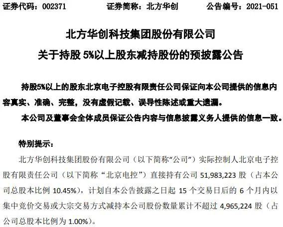 8月2日,北方華創(chuàng)發(fā)布公告稱,實(shí)際控制人北京電子控股有限責(zé)任公司計(jì)劃自公告披露之日起15個(gè)交易日后的6個(gè)月內(nèi),以集中競價(jià)交易或大宗交易方式減持北方華創(chuàng)股份數(shù)量累計(jì)不超過496.5萬股,占公司總股本比例1.00%。按目前股價(jià)計(jì)算,套現(xiàn)市值近20億元。