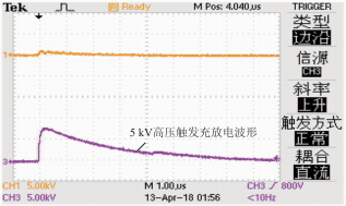 10kV直流高壓觸發(fā)電路制作完成后,順利實(shí)現(xiàn)了某化學(xué)含能材料的動(dòng)感觸發(fā)放電試驗(yàn),成功地采集到了放電波形圖,如圖8所示,深色曲線為5kV高壓觸發(fā)充放電波形,充電上升沿陡峭,充電時(shí)間短,放電較為平緩,放電時(shí)間較長,均符合設(shè)計(jì)與試驗(yàn)要求。通過對試驗(yàn)數(shù)據(jù)的分析,驗(yàn)證了10kV直流高壓觸發(fā)器在化學(xué)含能材料高壓放電試驗(yàn)中的應(yīng)用切實(shí)有效,且可靠性高。