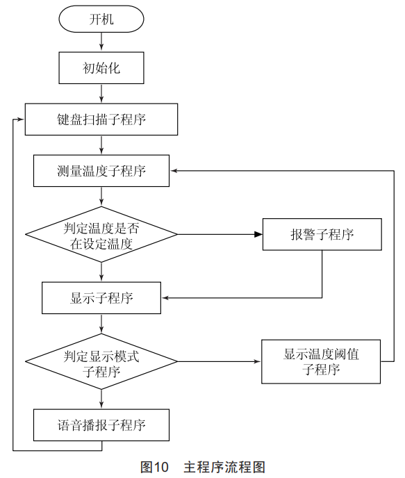 程序在開始執(zhí)行時首先要對主程序進行初始化,如溫度檢測程序、I/0口的初始化等。初始化結(jié)束后,執(zhí)行溫度測量的相關(guān)程序,實時測量當前的溫度值。將測得值與設定值進行比較,判斷此溫度是否超過了閾值,如果超過溫度上限或下限,則調(diào)用報警子程序并進行語音提示。主程序流程圖如圖10所示。