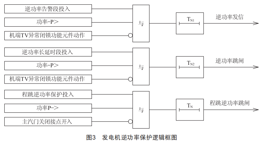 本裝置逆功率保護(hù)設(shè)有1段2時限,短延時發(fā)信,長延時跳閘[1],邏輯圖如圖3所示。