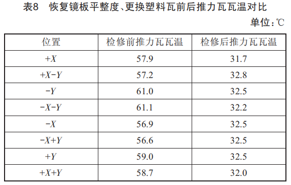 在此次事件的處理中,成功消除了鏡板由于應(yīng)力釋放引起的變形量,并將機(jī)組推力瓦換成塑料瓦,克服了鏡板變形導(dǎo)致的推力瓦面局部受力過大的情況,解決了推力瓦最大承載負(fù)荷過小的問題。該水電站1#機(jī)組自2020年2月A修竣工以來,運(yùn)行至今各項(xiàng)數(shù)據(jù)指標(biāo)正常,機(jī)組發(fā)電效率提高,為該站今后的安全生產(chǎn)做出了重大貢獻(xiàn)。