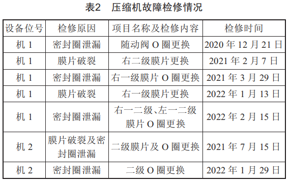 表2羅列了機(jī)1、機(jī)2自2020年12月15日投用以來設(shè)備檢修情況,從故障情況來看,O型密封圈密封失效及膜片破裂損壞是影響機(jī)組長(zhǎng)周期穩(wěn)定運(yùn)行的主要因素。