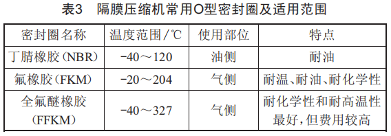 目前隔膜壓縮機(jī)選用的O型密封圈材質(zhì)主要是NBR和FKM,性能參數(shù)如表3所示,基本能滿足生產(chǎn)需要。但從表2可以看出,在廣州每年12月至來年2月氣溫驟降期間,易發(fā)生密封圈失效泄漏情況。因此,在此期間可進(jìn)行提前預(yù)防性維護(hù),密封點(diǎn)使用定力矩扳手緊固校核。