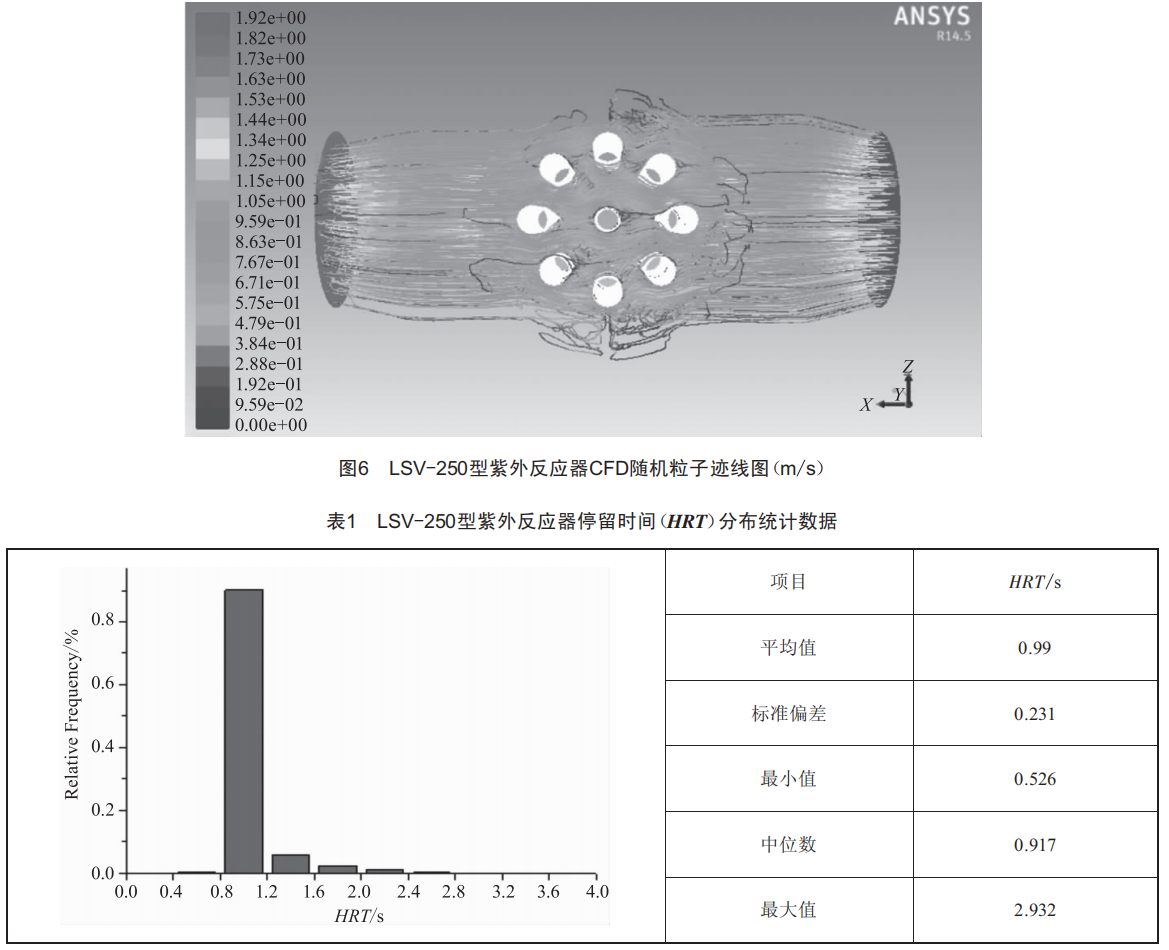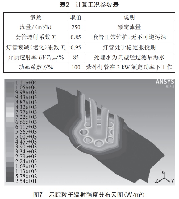 綜上所述,本文以LSV-250型紫外反應(yīng)器為例,通過使用離散坐標(DO)輻射模型求解具有吸收、散射和壁面反射性質(zhì)介質(zhì)的輻射運輸方程,輔助離散相模型(DPM)模擬浮游生物個體在紫外反應(yīng)器內(nèi)流區(qū)中的隨機運動,從而計算獲得浮游生物在流區(qū)內(nèi)的軌跡和停判定紫外反應(yīng)器的滅活效率。