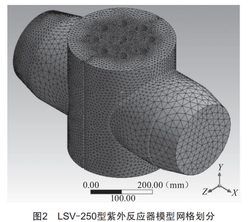 運用So1idworkS軟件建立紫外反應(yīng)器的內(nèi)腔體三維實體模型:Ⅹ軸正向為介質(zhì)流動方向,X軸為光源布置軸線方向。為簡化紫外燈管在套管內(nèi)的傳播及穿透石英套管的過程,將石英管外壁作為燈管的輻射源。運用ANSYSMeShing軟件對兩片擋板和套管外壁進行Ouad-pave型(間隔為4)面網(wǎng)格劃分,再分別以這些面為起始面對整個腔體進行TGrid型(Tet/Hybrid)體網(wǎng)格劃分。如圖2所示,整個紫外反應(yīng)器模型共分為584584個單元體、108979個節(jié)點。
