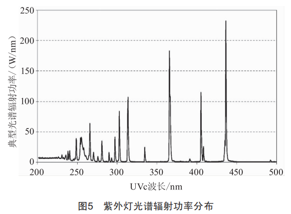 燈管的典型光譜輻射功率分布如圖5所示,其中UVc(波長200~280nm)功率占11.9%。
