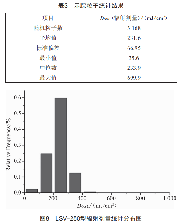通過DPM模型可計算得到模擬粒子在時間和空間上的位置(即軌跡信息),配合DO模型得出每個質(zhì)點的輻射強度,可以通過求解單位時間步長內(nèi)該質(zhì)點接收到的紫外輻射強度對粒子在流區(qū)內(nèi)停留時間的積分得到其運動軌跡所受的紫外光輻射的累積量,即輻射劑量(DoSe)。本文通過編程導(dǎo)入上述導(dǎo)出數(shù)據(jù)進行數(shù)值積分,再通過計算入流端面均布的大量隨機粒子的運動軌跡及其積分即可生成該反應(yīng)器輻射劑量統(tǒng)計分布。
