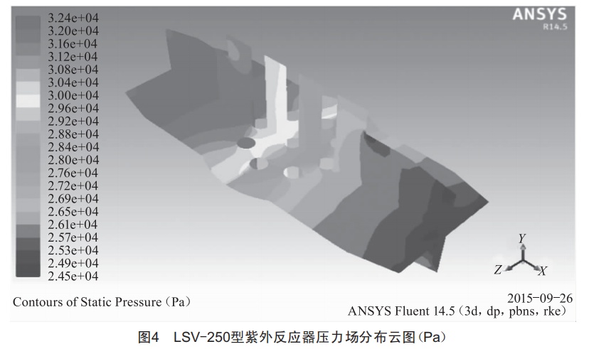 Fluent數(shù)值計算采用雙精度3d求解器,選擇標準y-epSilon(2eqn)湍流模型,動量和湍流動能采用二階迎風(fēng)差分,能量耦合、離散坐標和湍流耗散率采用一階迎風(fēng)差分,分別可求解得紫外反應(yīng)器內(nèi)部的速度場(圖3)和壓力場(圖4)分布云圖。