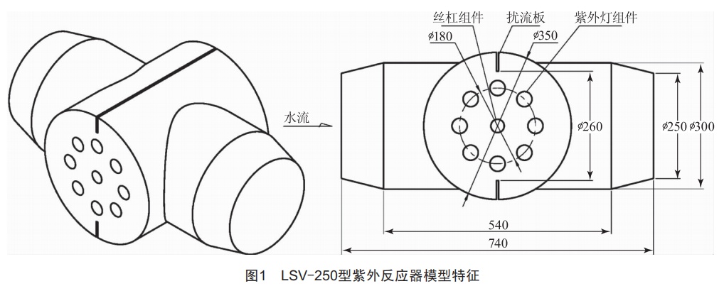-LSV-250型紫外反應(yīng)器作為研究對象,該反應(yīng)器為封閉四通管式反應(yīng)器(圖1),內(nèi)有8只最大功率為3kw的中壓紫外燈,與流線呈垂直布置,燈管外裝配有石英套管用作隔離介質(zhì),實現(xiàn)熱隔離及維護便利性。