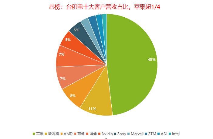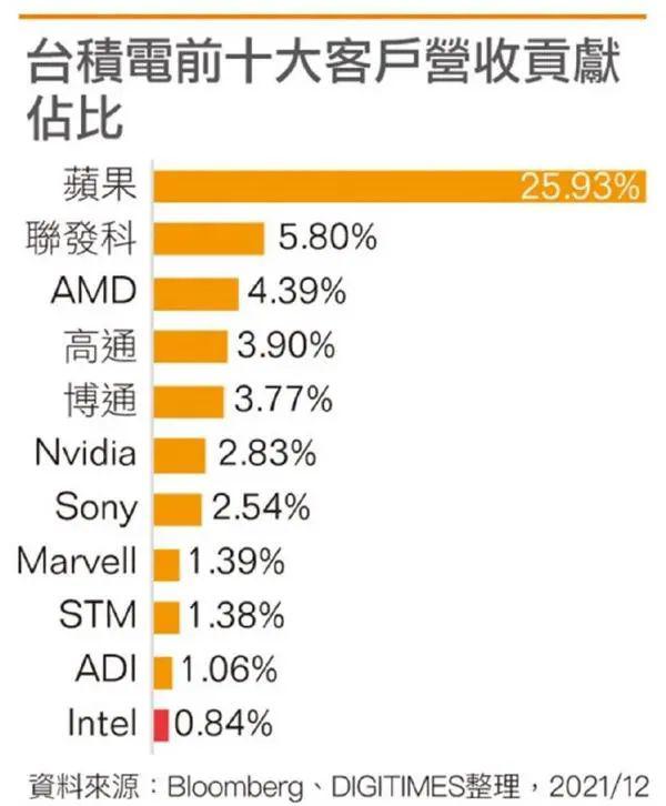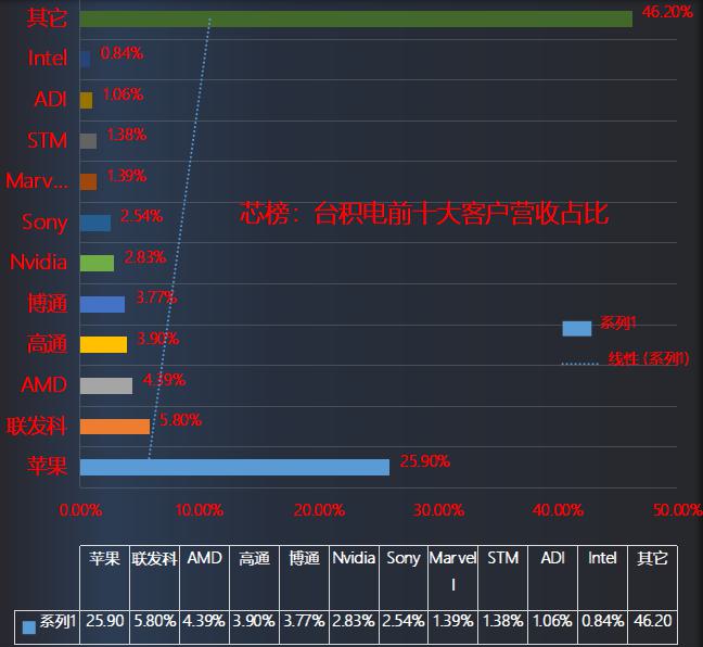 此外,digitimes 放出了一張來源于彭博社的數(shù)據(jù),曝光了臺(tái)積電前 10 大客戶營收貢獻(xiàn)占比。
