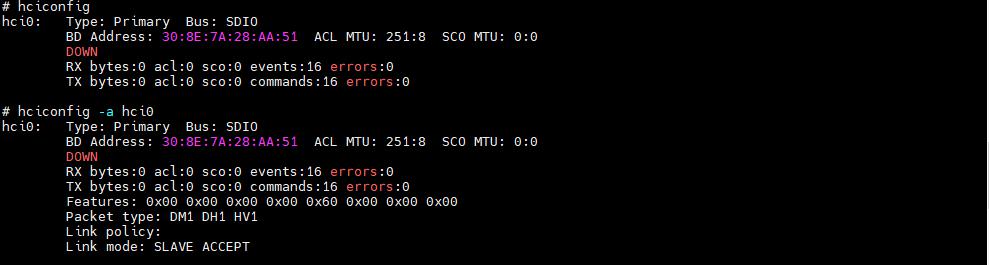 命令格式:hciconfig、hciconfig [-a] hciX [command ...]