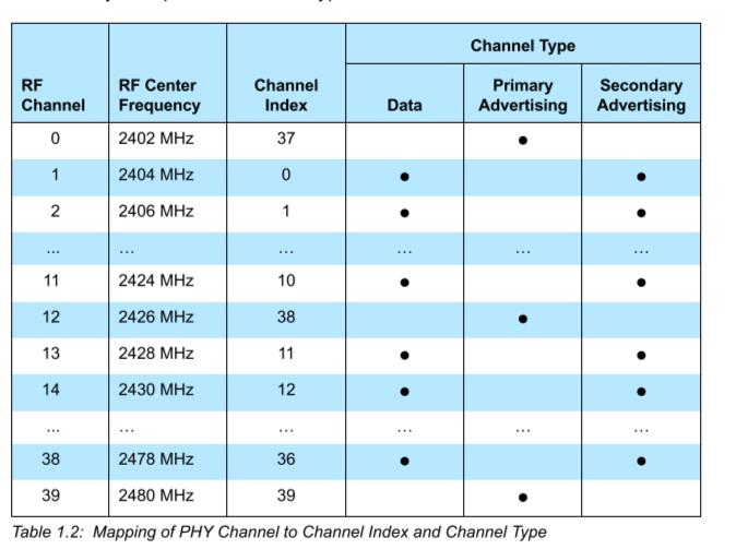 經(jīng)過(guò)上面的定義之后,BLE的物理通道已經(jīng)出來(lái)了,即“頻點(diǎn)分別是‘f=2402+k*2 MHz, k=0, … ,39’,帶寬為2MHz”的40個(gè)RF Channel。
