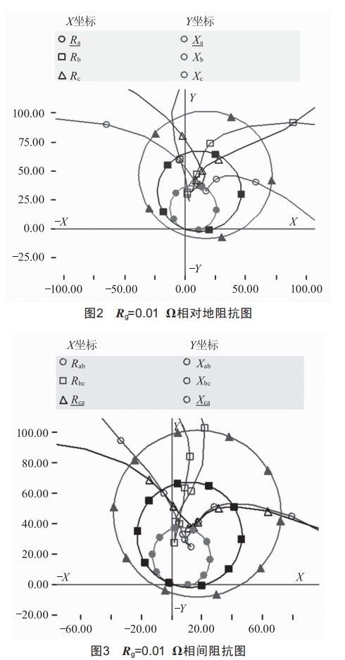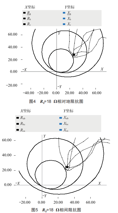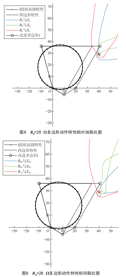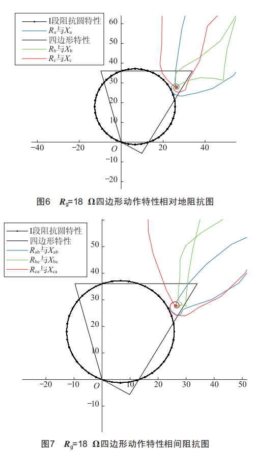 由圖6和圖7可知,當(dāng)用四邊形動(dòng)作特性來(lái)代替阻抗圓動(dòng)作特性且Rg=18Q時(shí),相對(duì)地阻抗與相間阻抗均在保護(hù)動(dòng)作的范圍內(nèi)。