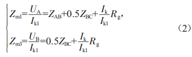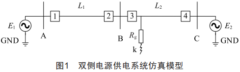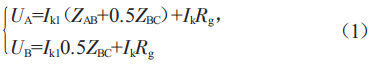 在圖1中,母線B、C這段線路的中點(diǎn)處發(fā)生短路故障,此時(shí)過(guò)渡電阻為Rg。其中電源E1提供的短路電流為Ik1,電源E2提供的短路電流為Ik2。短路電流Ik=Ik1+Ik2。