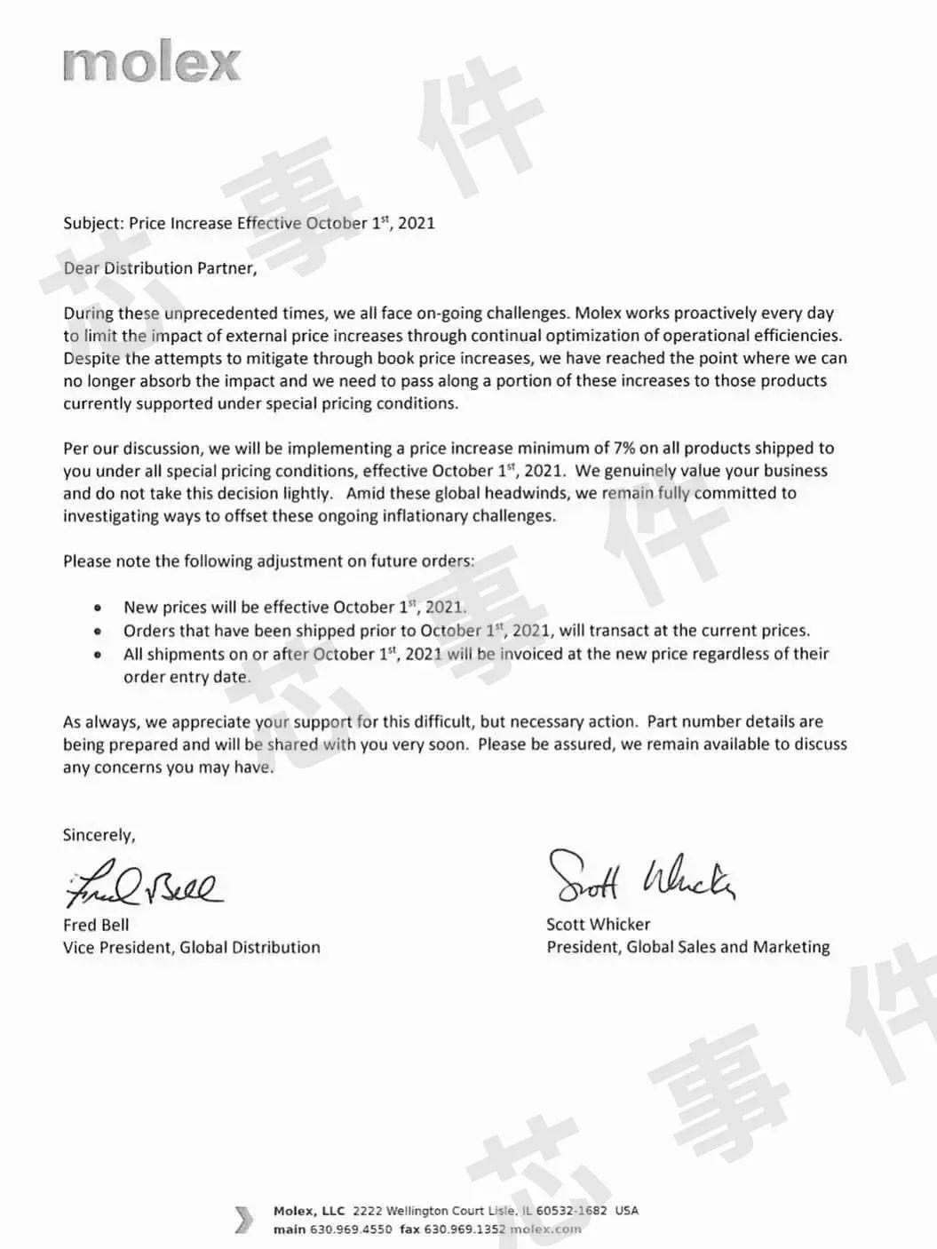 8月13日,Molex發(fā)布漲價(jià)函,漲價(jià)函表示,由于受到外部價(jià)格上漲的影響,經(jīng)過討論決定,將對(duì)在所有特殊定價(jià)條件下所有產(chǎn)品實(shí)施至少7%的價(jià)格上漲,自2021年10月1日起生效。