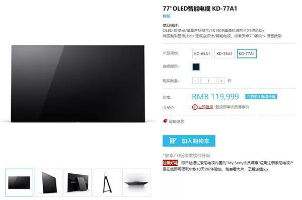 A1系列是索尼OLED電視的代表作,77英寸款(寬約1721mm,高約997mm)售價高達119,999元,擁有OLED自發(fā)光、銀幕聲場技術(shù)、特麗魅彩顯示技術(shù)、無底座設(shè)計等賣點,同時搭載4K HDR圖像處理芯片X1進階版,運行安卓7.0系統(tǒng),支持語音搜索。